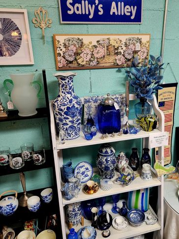 Her booth is filled with elegant blue-and-white pieces, rich cobalt glass, vintage and artisan jewelry,